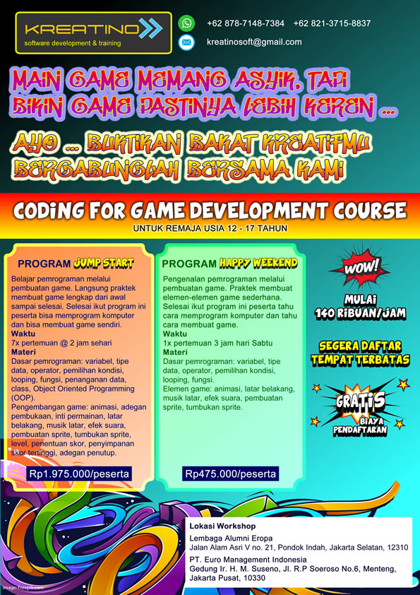 Belajar pemrograman melalui pembuatan game. Langsung praktek membuat game lengkap dari awal sampai selesai. Selesai ikut program ini peserta bisa memprogram komputer dan bisa membuat game sendiri.